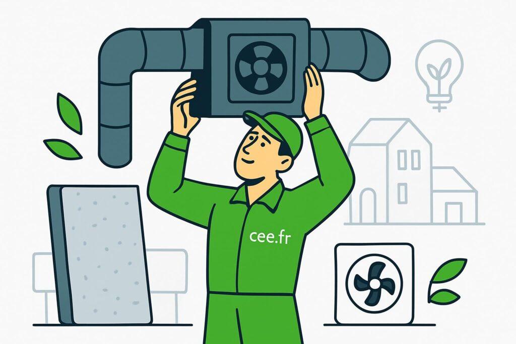 Les dispositifs CEE peuvent soutenir des opérations qui améliorent la performance énergétique ou la qualité de l’air du logement. Sont souvent retenus : remplacement d’un caisson ancien par un modèle plus performant et silencieux, installation d’un échangeur avec meilleur rendement, ou travaux d’isolation des réseaux aérauliques.